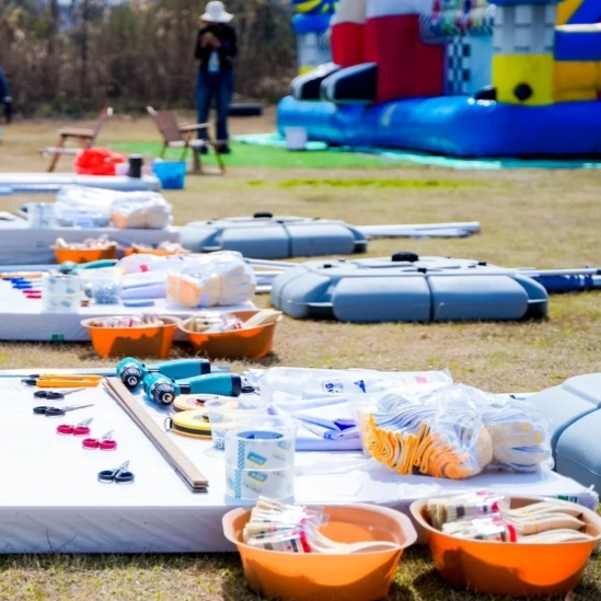 用木方或者金属角钢按照图纸搭建出一艘大船的骨架,用画布制作船身与船帆,在船帆上可以绘制企业的logo、口号或其他装饰。通过所有参与者的努力,手工搭建一艘高3米宽12米的战舰,象征着团队无坚不摧,一路乘风破浪,也象征着一帆风顺。