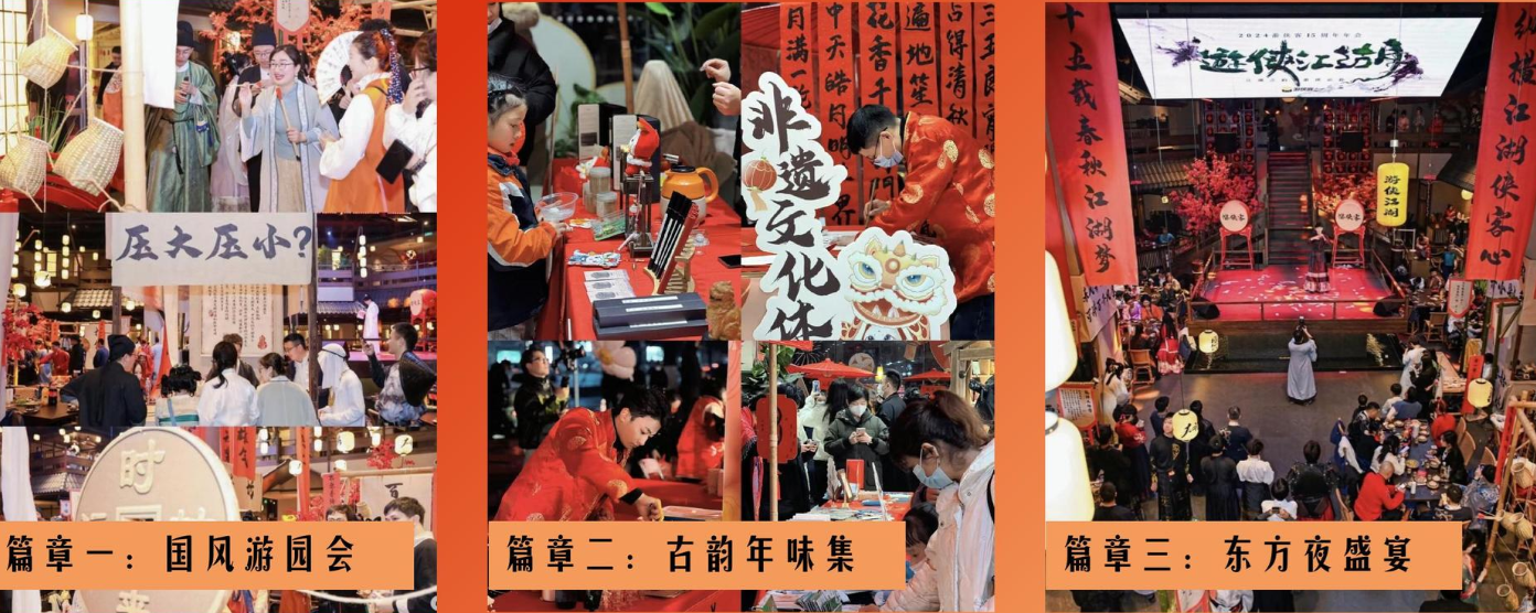 活动调性:以国风为底色,绘文化之芳华,以“国风游园”“古韵集市·’“东方夜宴”三个篇章打造国风文化年终盛典,一起启动穿越之旅,感受璀璨的东方文化致敬国风。