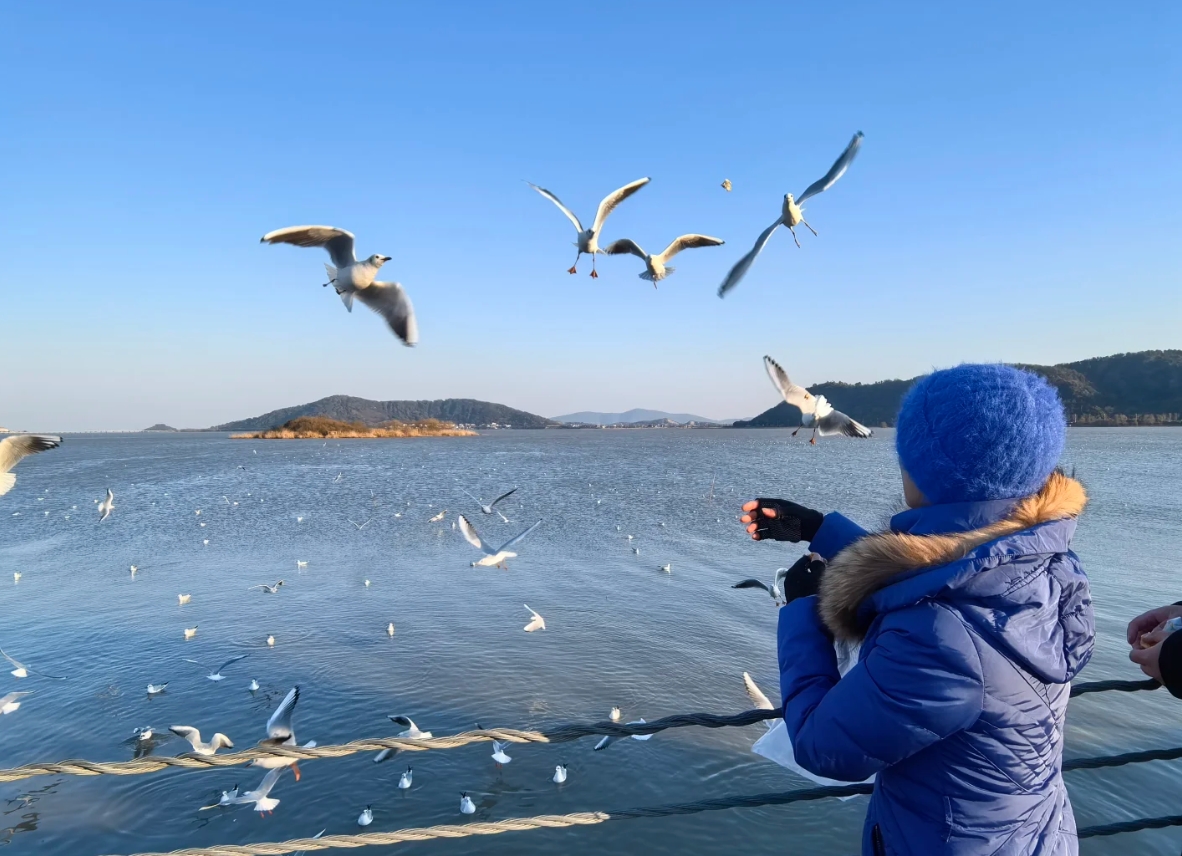 15:00 左右,前往横山岛,穿过长桥,来到岛上,这里还有一群特殊的 “朋友”—— 红嘴鸥。当你来到湖边,便能看到它们成群结队地在水面上翱翔、嬉戏。它们身姿矫健,洁白的羽毛在阳光下闪耀着光芒,红色的嘴巴和爪子格外醒目。拿出一些面包屑,轻轻抛向空中,红嘴鸥便会迅速地飞来,争抢着美食。