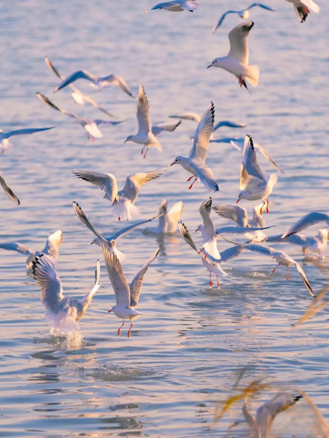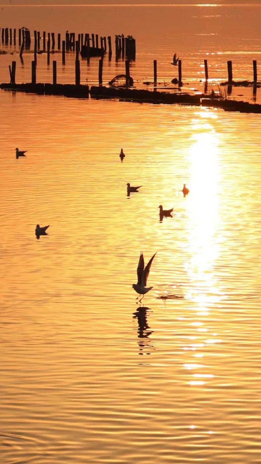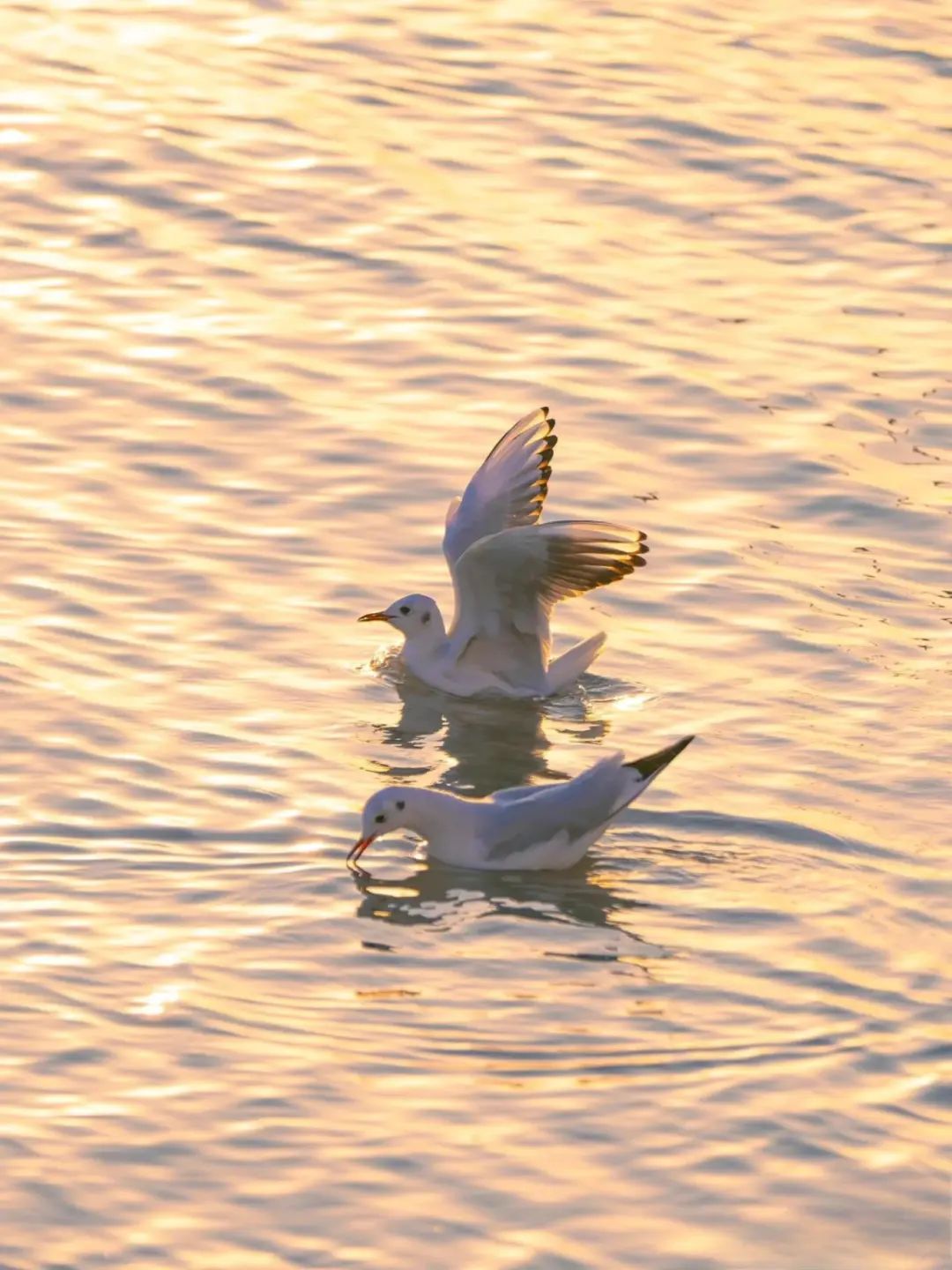 红嘴鸥在霞光中翱翔,它们的身影与金色的湖面相互映衬。
