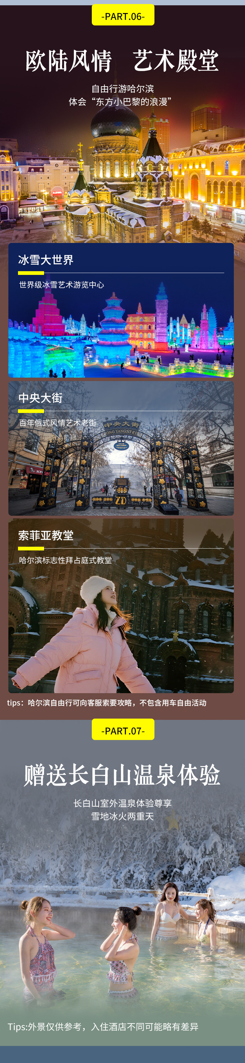 4、不含接送机,如需安排请最少提前2日和客服联系,哈尔滨接送机包车5座轿车150元/趟,夜航190元;7座商务车240元/趟,夜航290元/趟;夜航时间为21:00及以后-次日07:00及之前落地或起飞的航班,春节团期+50元/台车,包车费用以太平机场前往哈尔滨主城区定价(南岗区、道里区、道外区),如需包车前往其他区域请联系客服现询价;接机车辆非行程用车无空座。