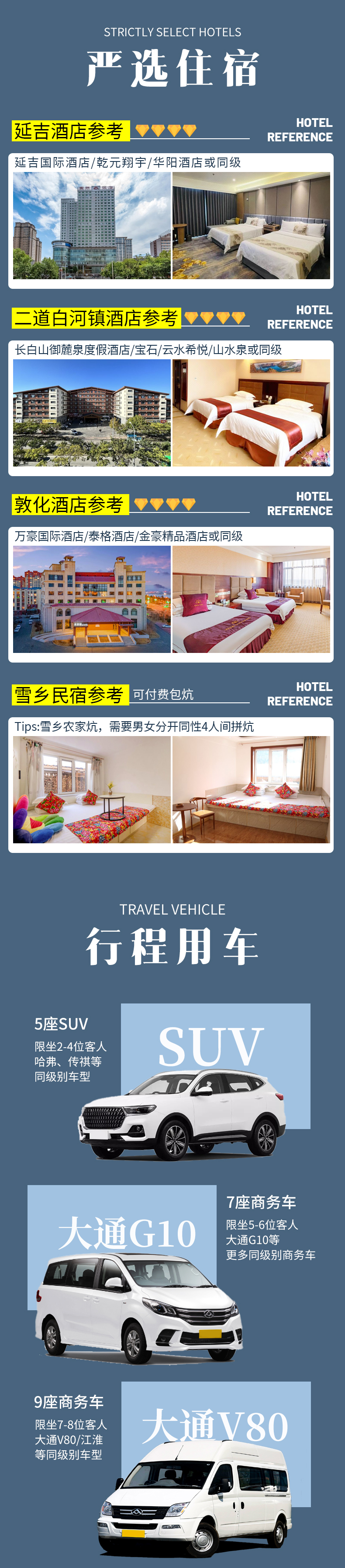 3、用车:2-4客人用5座SUV,5-6客人用7座商务车,7-8客人用9座商务车,根据人数安排用车大小,不指定用车(小团副驾驶及前后座位置需要轮流乘坐,望悉知);